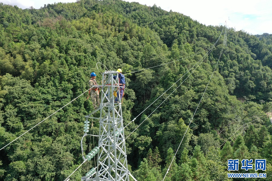 在抚州市金溪县秀谷镇,电力工人冒着高温,对线路进行巡检,及时消除安全隐患,保障当地生产生活正常用电。新华网发 邓兴东 摄