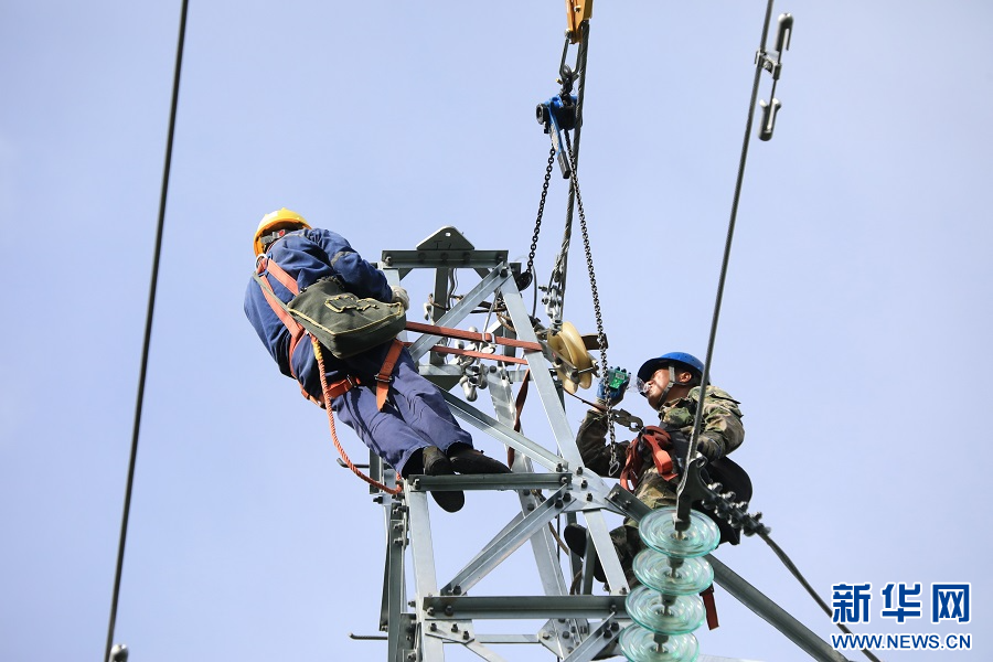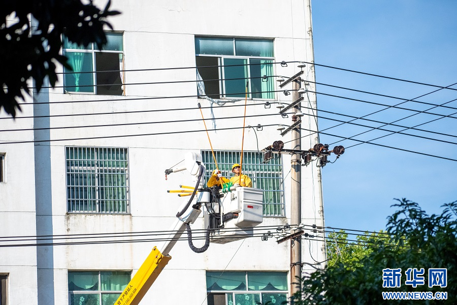 近日,在江西省抚州市乐安县金竹畲族乡,电力工人正冒着酷暑进行高空作业,为群众提供强劲可靠的电力供应,保障群众清凉度夏。新华网发 邱志超 摄