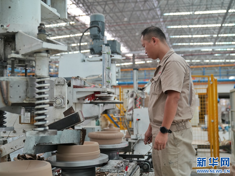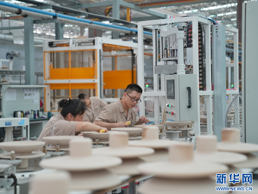 在江西省萍乡市芦溪县工业园的大莲电瓷(江西)有限公司生产车间内,工人们正冒着高温赶制电瓷产品。新华网发 王强 摄