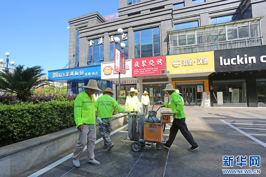 在抚州市金溪县秀谷镇,施工人员头顶烈日,重新划定停车线,规范市民停车。新华网发 邓兴东 摄