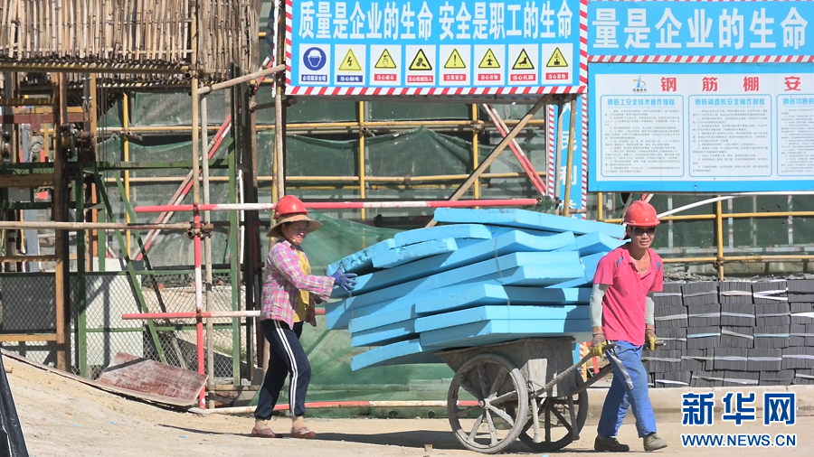 在抚州市资溪县,建筑工人正在运送建筑材料。新华网发 黄诗涵 摄