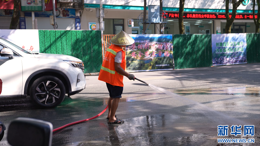 在抚州市资溪县,环卫工人正在冲洗地面。新华网发 黄诗涵 摄