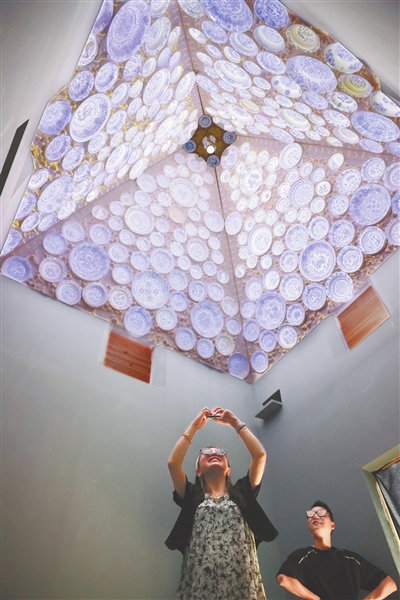 7月13日,御窑景区一处蕴含着景德镇青花瓷基因的穹顶,吸引游客打卡拍照。
