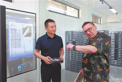 7月12日,景德镇古陶瓷基因库负责人翁彦俊(左)向来自波兰的陶瓷爱好者皮特介绍物理和数字形态的基因库标本。