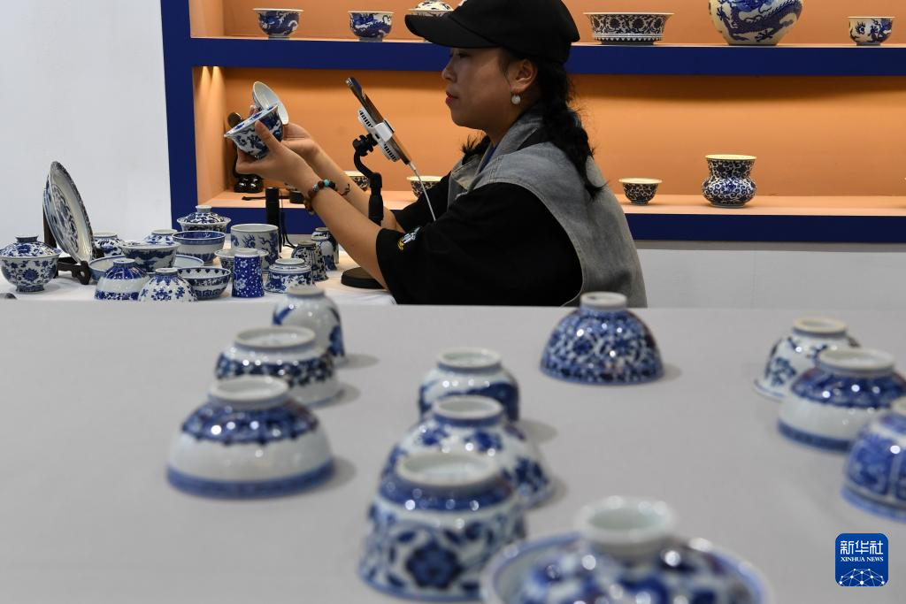 10月18日,一名参展商在瓷博会现场进行网络直播销售。新华社记者 马宁 摄pagebreak