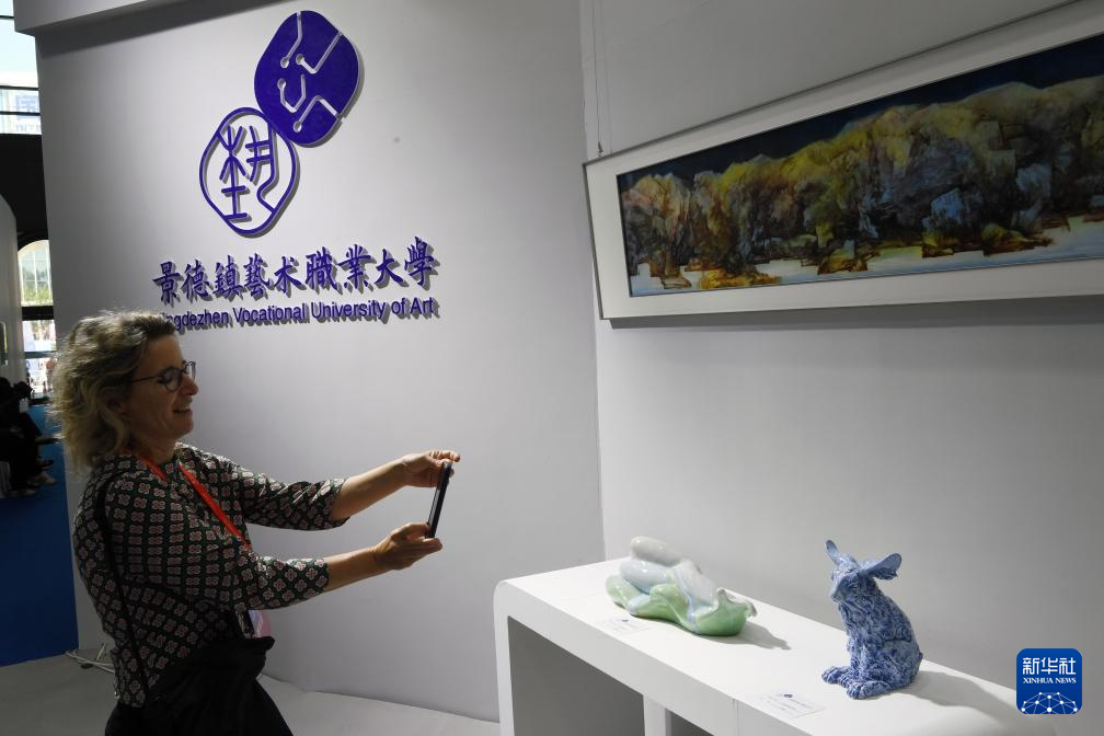 10月18日,一名外国参观者在瓷博会高校展区拍摄陶瓷艺术品。新华社记者 马宁 摄