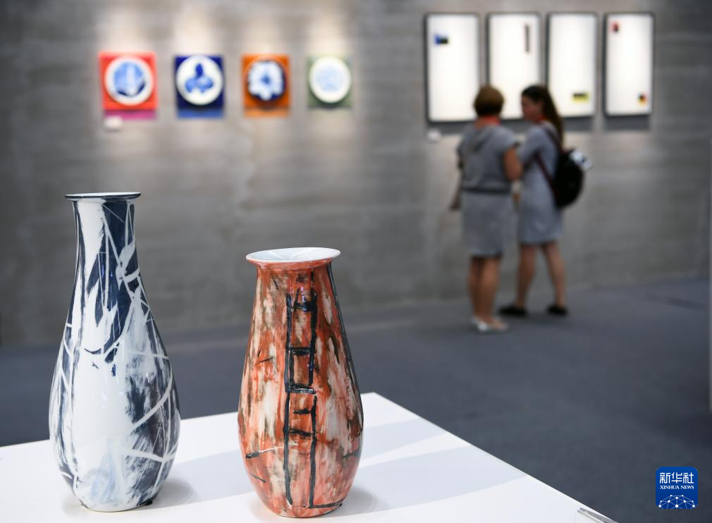 10月18日,两名外国参观者在瓷博会上欣赏陶瓷艺术品。新华社记者 马宁 摄pagebreak