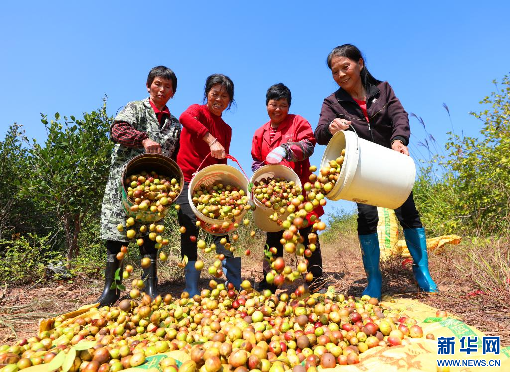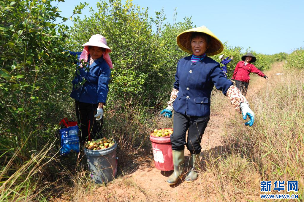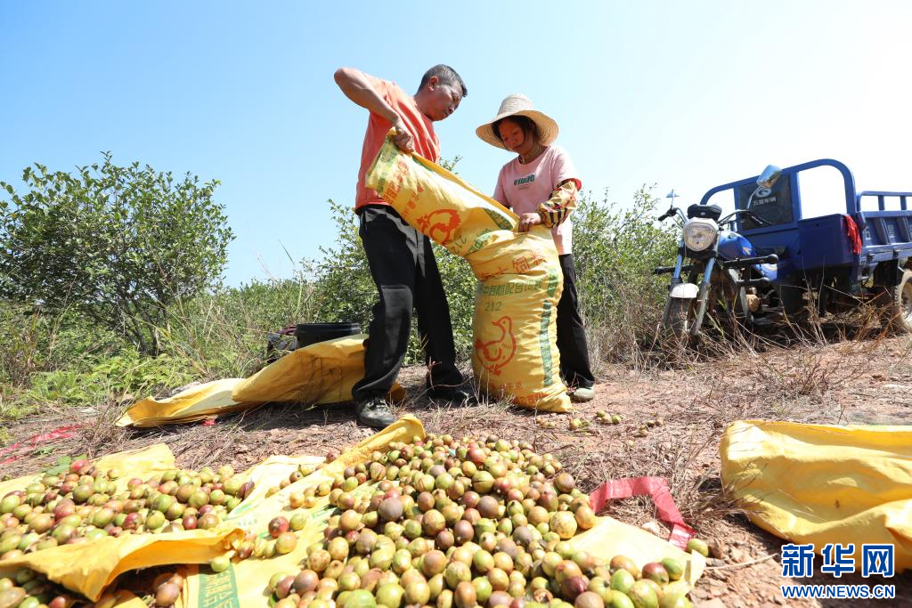 村民正在将采摘好的油茶果装袋。新华网发 邱志超 摄
