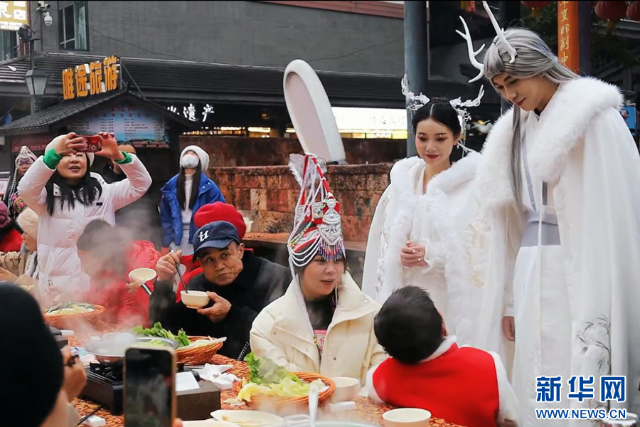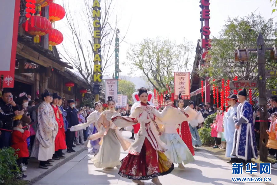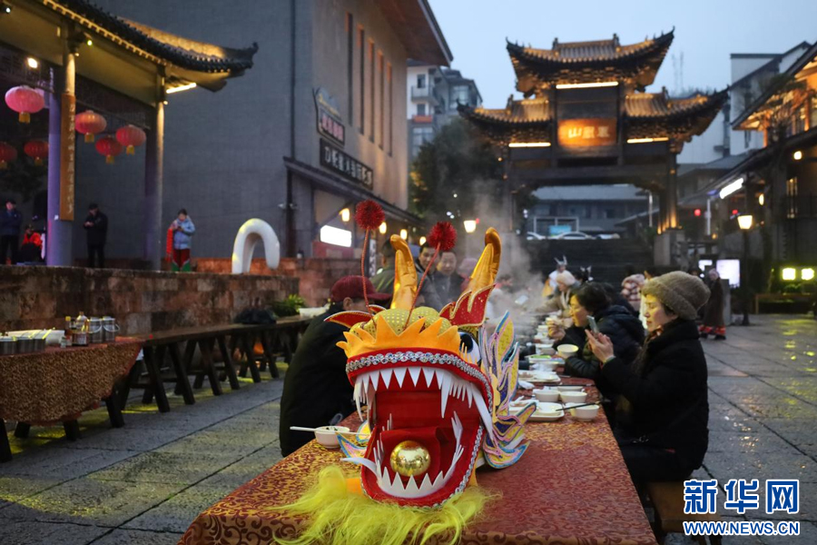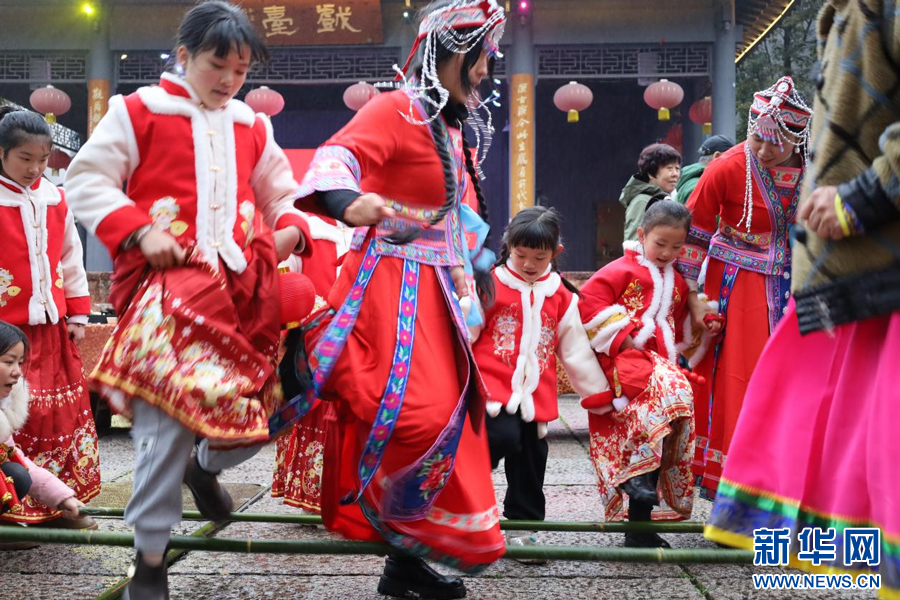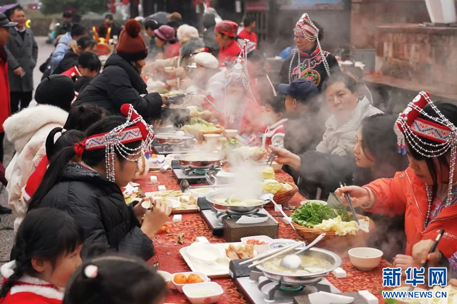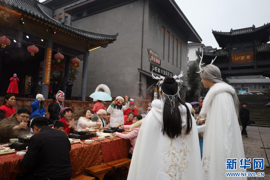春节临近,江西省宜春市明月山古井泉街准备了热闹的畲家长龙宴,盛装的畲乡姑娘们为游人们敬畲酒、展示竹竿舞,给大家带来民俗食宴。