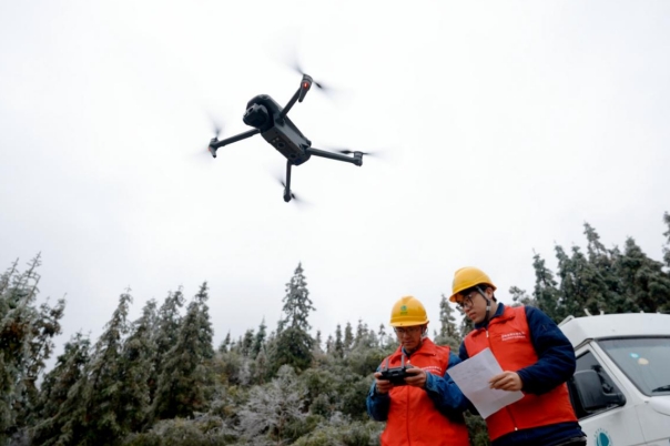 国网萍乡供电公司“井冈先锋”共产党员服务队利用无人机巡视检测线路覆冰情况