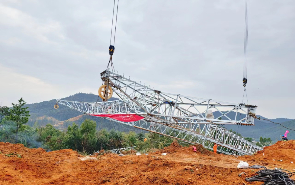 “慢慢升高,注意力度!”胡星华通过对讲机指挥吊车司机。15分钟后,铁塔成功起吊到一定高度,此时拉V塔的底部塔尖精准落入地面原有的基础接口上。地面作业人员迅速采用螺栓紧固到位,铁塔吊装组立主体任务顺利完成。至此,所有人悬着的心终于落地了。