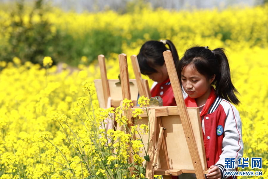 孩子们在油菜花海间玩耍。新华网发 韩海建 摄