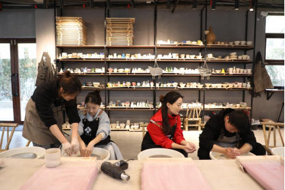 在陶源谷瓷源境的“百工百匠——非遗传承基地”,媒体记者与达人们近距离领略了各类非遗技艺的精湛与独特。紧接着,一行人来到了言予窑陶艺体验空间。在这里,大家有机会亲手体验陶艺制作的乐趣。在陶艺师的指导下,大家体验了从揉泥到塑形的过程。文旅博主“麦子玩转江西”在体验完陶艺制作之后表示,这是她第一次来到陶源谷,感觉这里充满了文艺气息,是一个能让生活慢下来的地方。