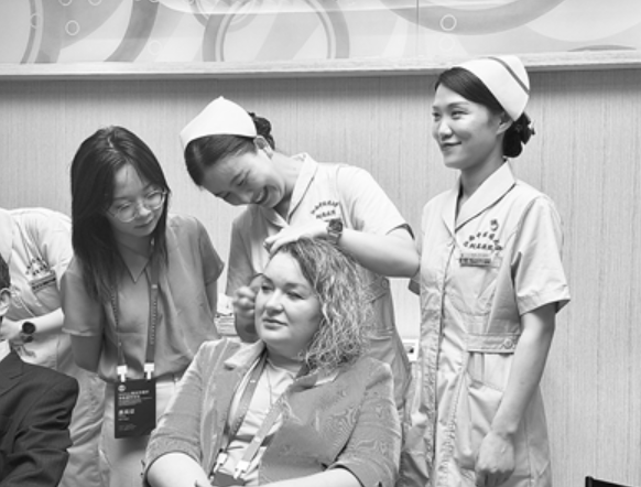 2024上海合作组织传统医学论坛举办期间,国际友人走进江西中医药大学附属医院体验耳部刮痧。(曾悦之)