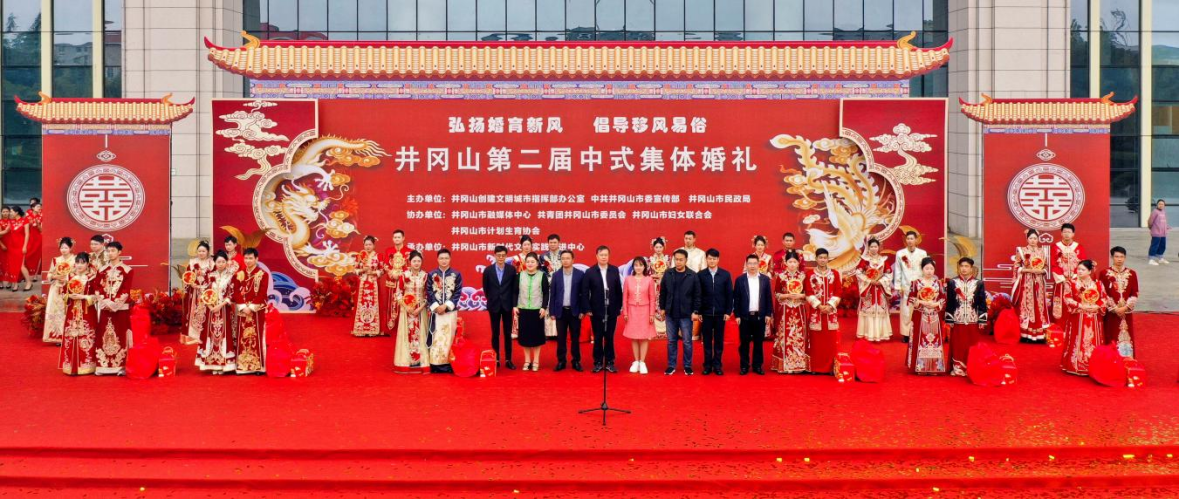 11月15日,由中共井冈山市委宣传部、井冈山创建文明城市指挥办公室、井冈山市民政局联合主办的“弘扬婚育新风 倡导移风易俗”井冈山第二届中式集体婚礼活动在井冈山市新时代文明实践广场举行。
