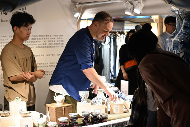 2024年10月17日,西班牙陶艺家乔曼在陶溪川春秋大集上向游客介绍自己的陶瓷作品。(隋尚君 摄)
