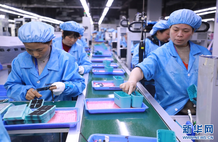2月19日,在抚州市东乡区荣华人工智能产业园生产车间内,工人们正在生产线上赶制智能音箱、学习机等电子产品订单。连日来,东乡区各企业按下生产“快进键”,开足马力忙生产,冲刺第一季度“开门红”。新华网发 占人豪 摄