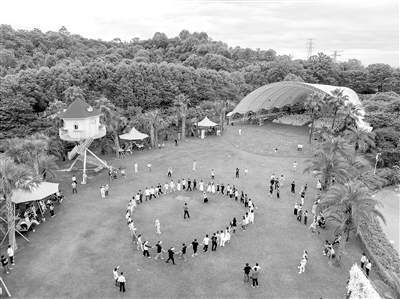 金溪县浒湾镇山下村乔治棕榈山庄景区曾经是采矿废弃地,经过生态治理后,成了当地生态旅游胜地。图为5月20日,游客在乔治棕榈山庄景区游玩。特约通讯员 邓兴东摄