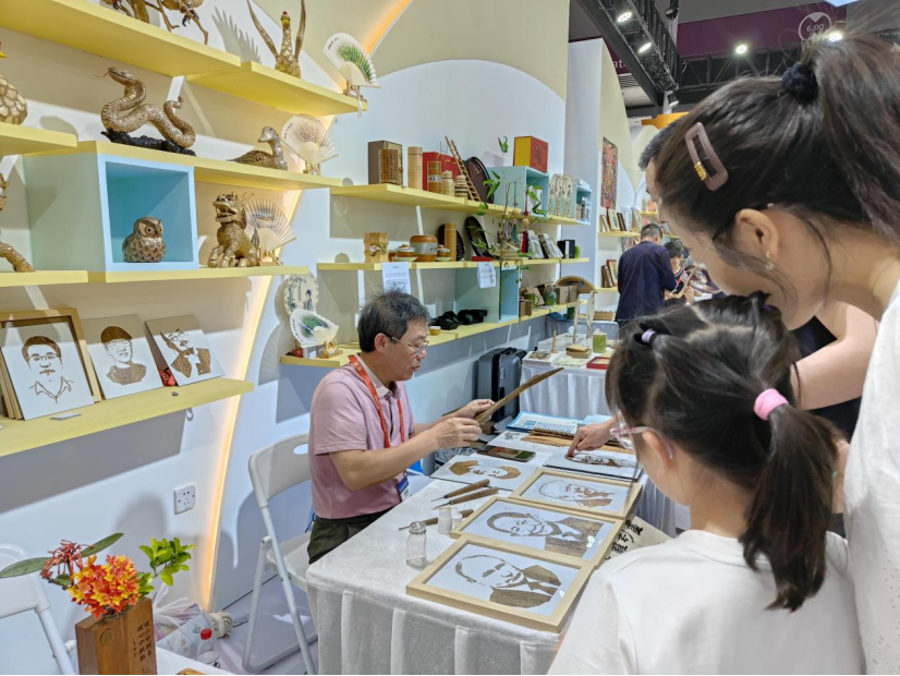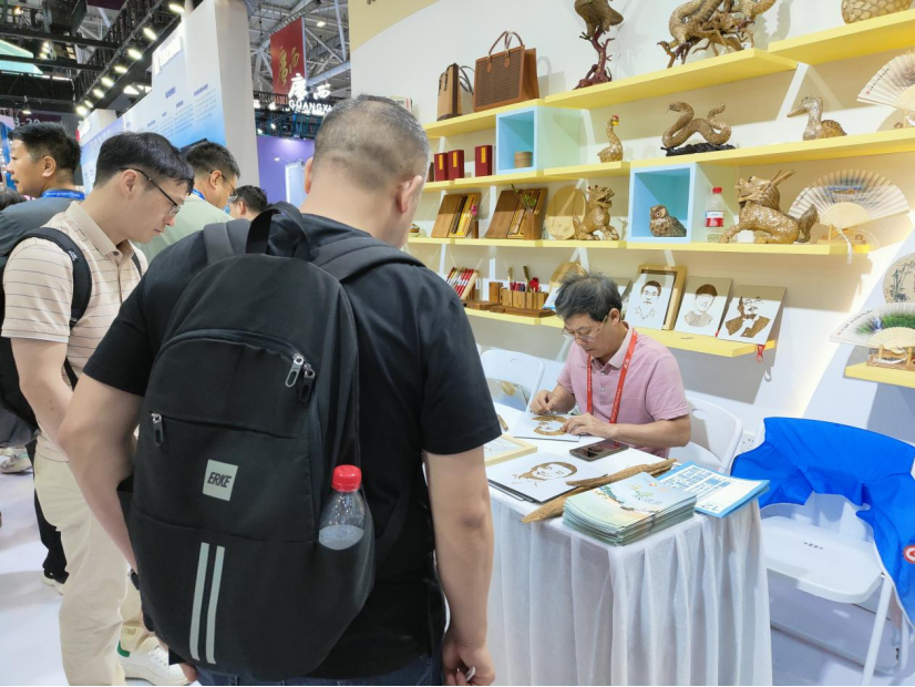 在江西11号馆竹制文创展区,《龙腾盛世》《金蛇献瑞》《袁隆平》等乐安竹衣工艺品精彩亮相,传承人陈亮现场进行手工艺创作演示,吸引眼球,引人驻足。