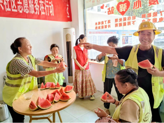 涂埠镇康乐社区工作人员专门购置了保温桶和冰镇西瓜,以确保饮品在高温下不变质;白莲湖社区推出了“流动清凉车”,跟随环卫工人的作业路线提供服务;新兴社区不仅准备了传统的消暑饮品,还特意备好了防暑药品。