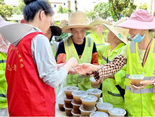 “快来喝碗绿豆汤降降温。”涂埠镇同心社区的党员志愿者热情地招呼着过往的户外劳动者。