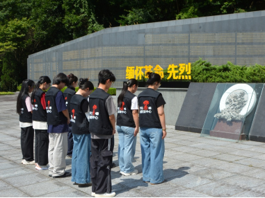 随后,怀揣着对革命先烈的崇敬之情,实践队队员们踏入浏阳烈士陵园,园区内山环水绕、绿树成荫,队员们深深地注视着纪念碑上20万位革命先烈的名字,回忆烈士们不怕牺牲、舍生忘死的革命英雄主义精神,并为牺牲的革命先烈们默哀。