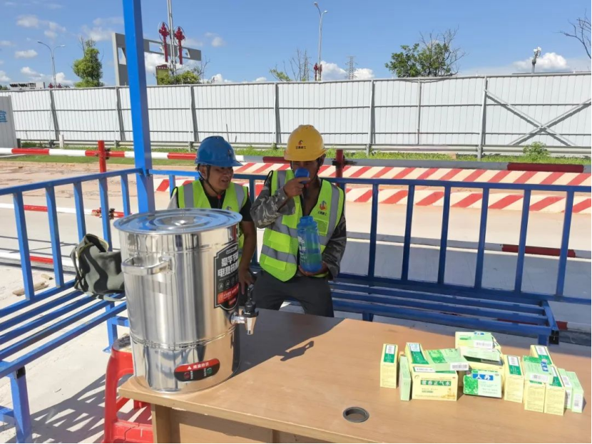 在项目休息区,一间蓝白相间的“清凉驿站”格外醒目。工人们趁着工作间隙,在“清凉驿站”里乘凉、喝水、聊天。48岁的电工老陈擦着汗说:“这么热的天最怕的就是中暑,好在项目部给我们准备了防暑降温的用品。”