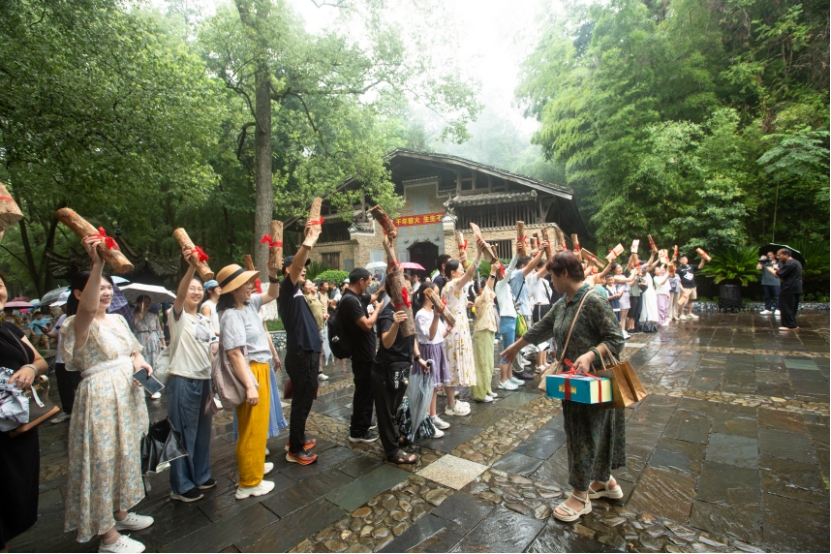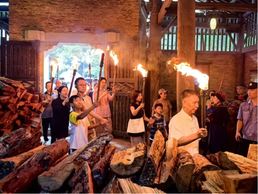 紧接着,非遗传承人烧窑把桩师傅江镇初宣布点火烧窑。点火仪式后,“人人加柴・家家财旺”添柴活动将现场氛围推向高潮。游客们手持松柴,有序为窑炉添薪,共同演绎“接财接福接好运”的美好图景,也寄托着大家对生活富足的热切祈愿。