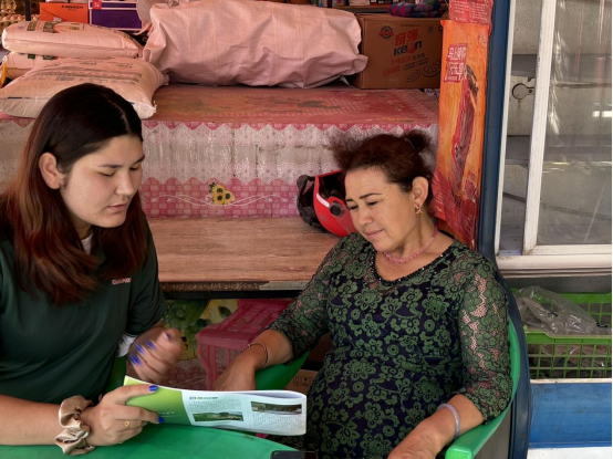针对社区居民普通话使用需求,实践队深入商户、居民家中,提供“一对一”发音纠正、政策宣讲翻译等服务。团队采用“维吾尔语+普通话”双语情景教学模式,志愿者们带着普通话宣传册、拼音卡片,向沿街商户、居民热情介绍。