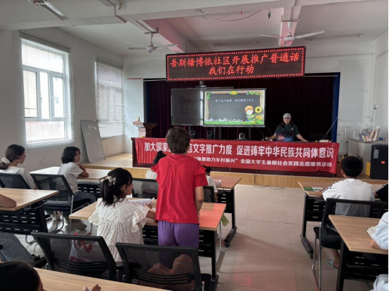 夏日炎炎的南疆小镇,一群维吾尔族孩子围坐在教室中,跟着推普志愿者一字一句地朗读绕口令,清脆的童声穿透门窗,飘荡在吾斯塘博依社区的上空。