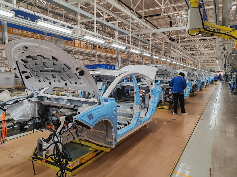 江西江铃集团新能源汽车有限公司生产线上,工人们正在加紧组装新能源汽车。