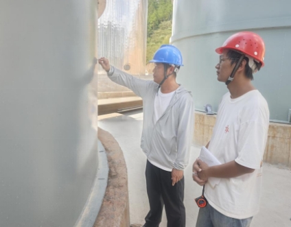 在江西沃氟化工厂内,师傅龚财伟正给徒弟周聪讲解着罐区管道的工艺流程及安装工艺。这已经不是他们待过的第一个项目了,去年在江西建工安装承建的新干中盐公司锅炉安装项目中他们已是师徒,如今是他们共事的第二个项目。