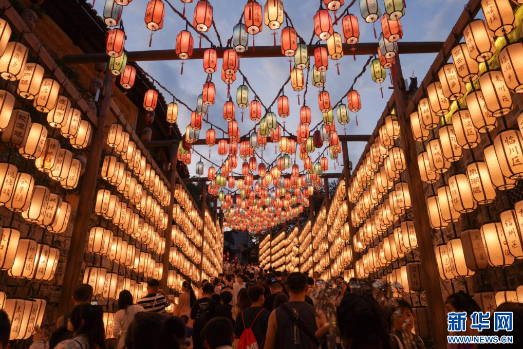 望仙谷景区灯火通明,木质楼阁如梦似幻。新华网发