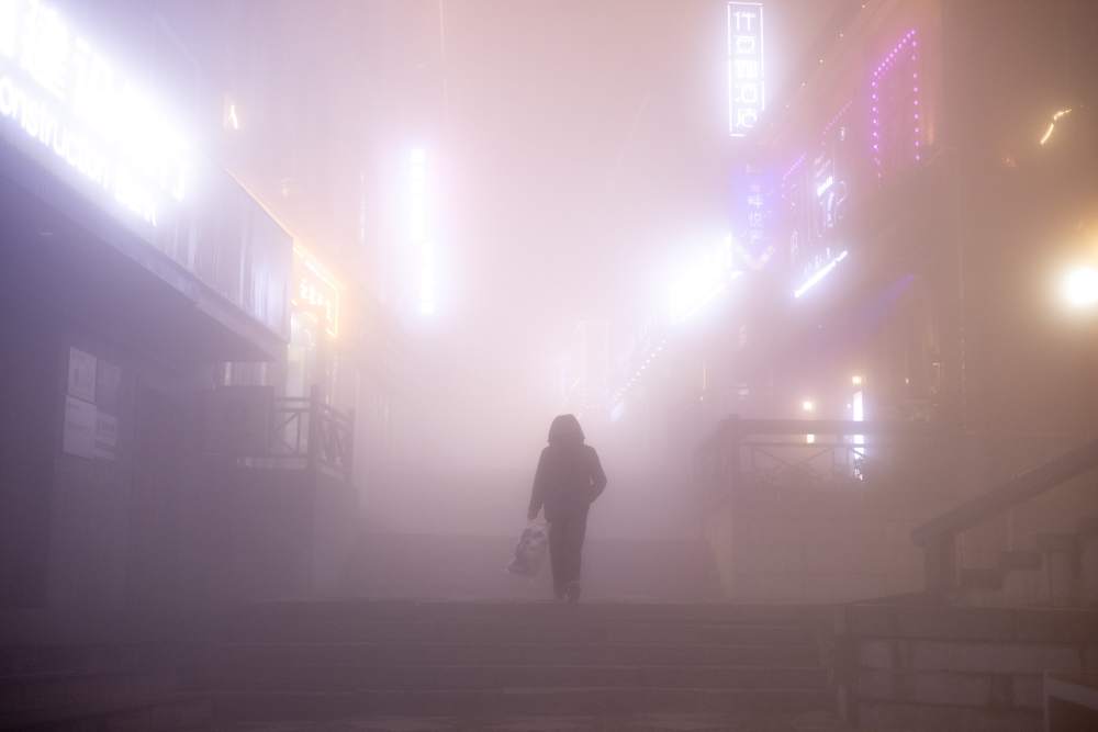 虽然前期浓雾为拍摄带来挑战,但也激发了摄影师的创作灵感。美联社签约摄影师Dan Sandoval对云雾中的山城产生了浓厚兴趣。他展示一张颇为满意的作品说道:“你看,一个人从狭窄的山路走下来,光影与行人,配合雾气缭绕的环境,让照片充满独特意境。”