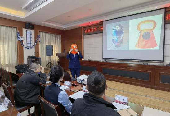 “大家看,消防面具套在头上的时候,一定要将露在外面的头发一并塞进面罩里,同时将拉扣拉紧,最好不要松手。”南昌消安安全服务公司的章明远教官头戴消防面具,在西湖区烟草专卖局的会议室里演示着标准操作,台下职工们看得目不转睛,纷纷拿出手机记录要点。