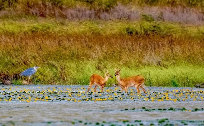 鄱阳湖候鸟保护区朱市湖几只河麂悠然涉水。郑文斌 摄