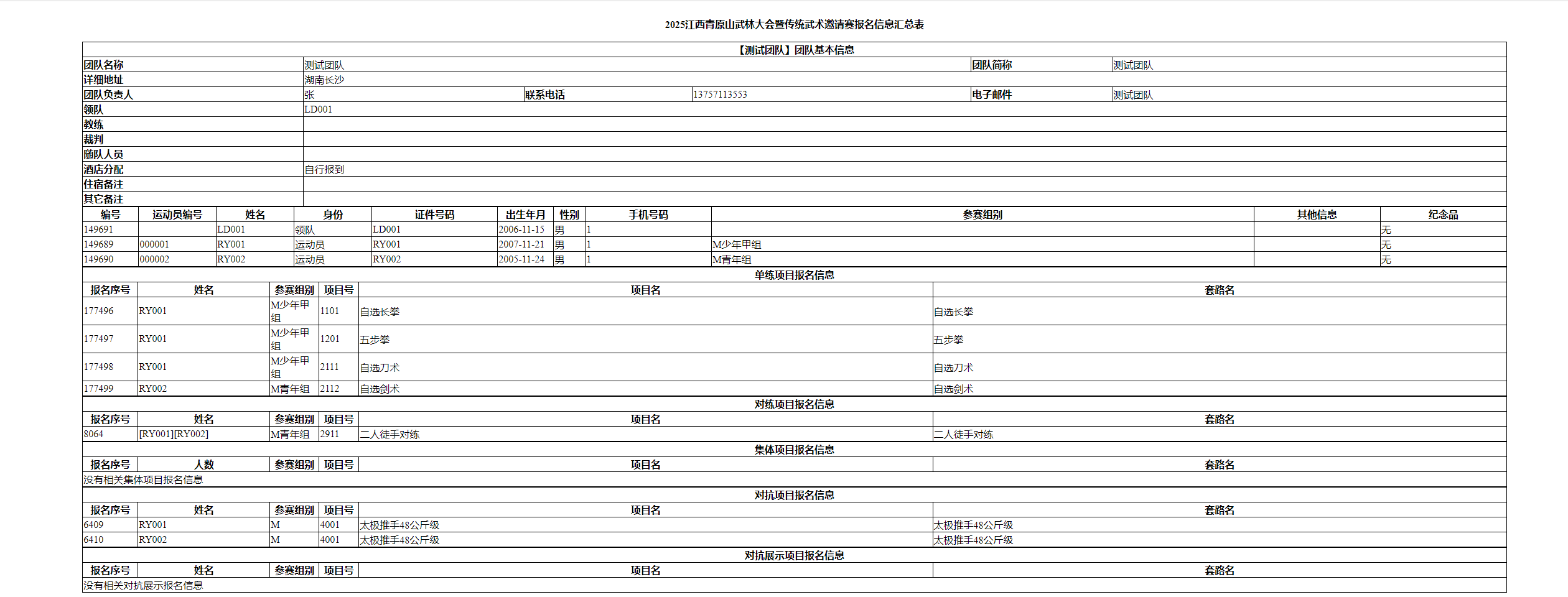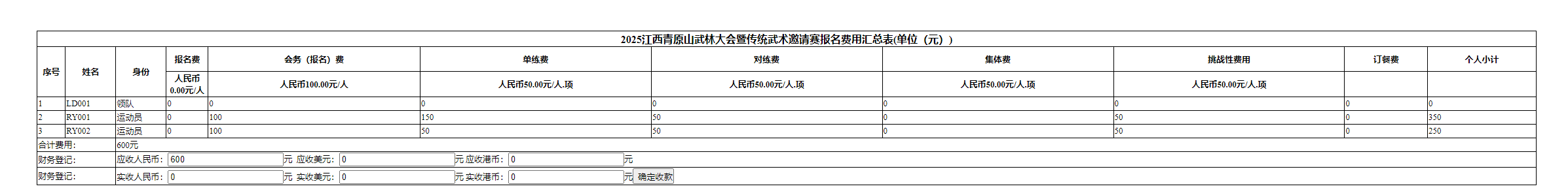 16.报名结束后,从统计分析的二张表中核对报名资料和费用是否正确,如无异议,就打印出来,连同运动员身份证复印件.安全责任声明书.汇款单复印件一起用快递邮寄给组委会。报名流程结束。