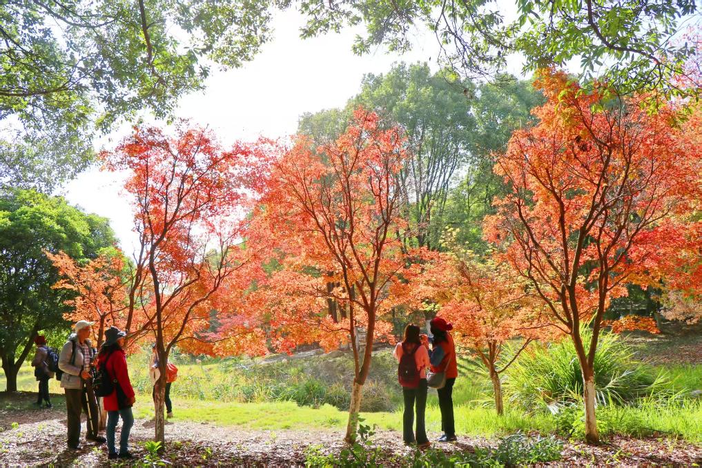 游客在南昌凤凰沟景区枫树下游玩。新华网发 虞亮亮 摄