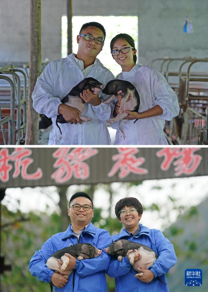 拼版照片:上图是卢丹(左)、邹玲丽抱着猪仔在当年创业的猪舍里合影(2015年7月31日摄);下图是卢丹(左)、邹玲丽抱着猪仔在幕村杭猪生态农场门口合影(2025年12月3日摄)。新华社记者 万象 摄pagebreak