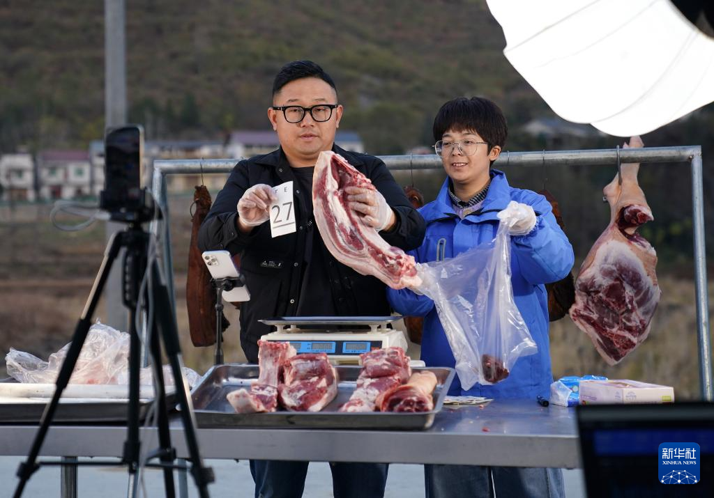 在位于江西省修水县港口镇红苏村的幕村杭猪加工基地,邹玲丽(右)与主播在直播平台销售猪肉(12月3日摄)。新华社记者 万象 摄