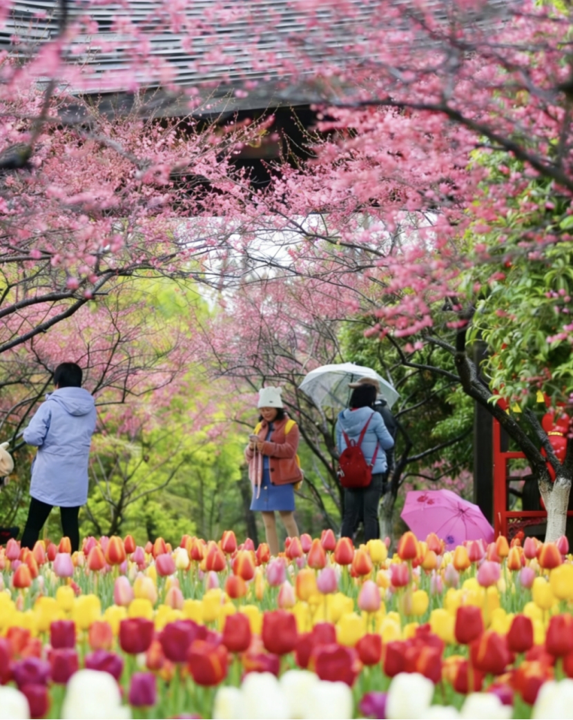 梅花正艳,郁金香也已提前就位。种下了更早开放的品种,让游客一次打卡两种浪漫。