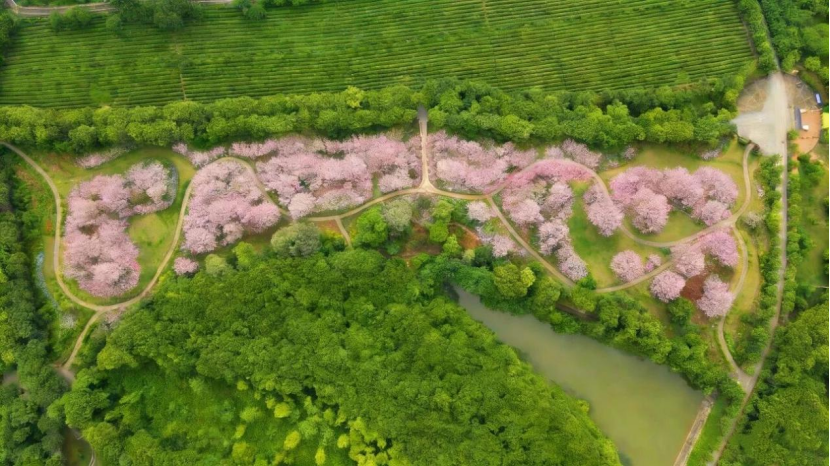 从空中俯瞰凤凰沟景区绣球园内的“垂枝梅瀑布”效果图。