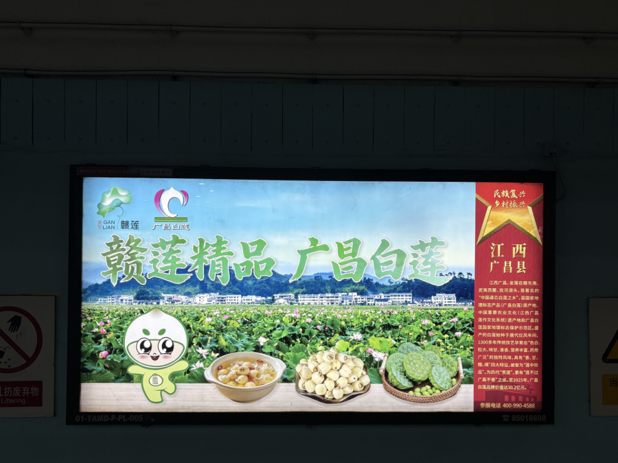 据了解,《辉煌的中国》主题展旨在通过人文历史、生态环境、乡村振兴等多维度,集中展示全国各地的发展成就;“赣莲精品广昌白莲”品牌宣传展位,位于北京地铁1号线天安门东站轨道层6车厢2门,该站点是通往天安门广场、人民大会堂、国家博物馆、故宫等国家标志性场所的必经之站,客流量大、关注度高,此次宣传海报展期1年,从本月开始持续至2027年1月上旬,通过现场设置一块长3米、宽1.5米的灯箱海报,全年全天候静态画面展示“赣莲精品广昌白莲”品牌形象,可实现更快速度、更大范围、更多人次的宣传效应,进一步做强广昌白莲区域公用品牌、打造“赣莲”品牌。 (徐维栋)