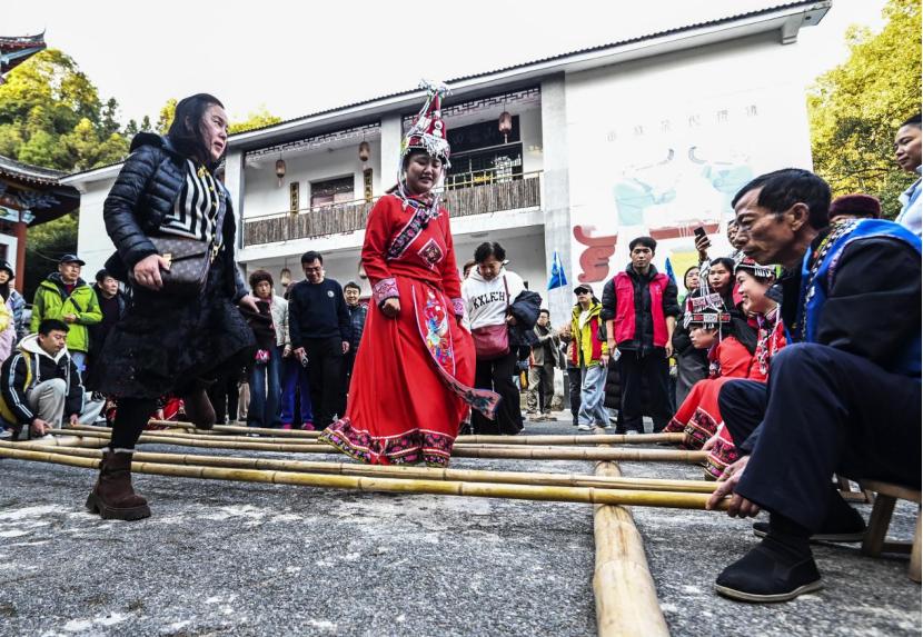 2026年1月13日,游客在江西省抚州市资溪县乌石镇新月畲族村体验畲族婚俗庆典。当日,来自上海、江苏等地的400多名游客与该村畲民身着节日盛装,参与山歌对唱、竹竿舞、婚嫁、传统美食制作等畲族民俗文化体验活动,让游客体验独特的畲族文化。(吴志贵)