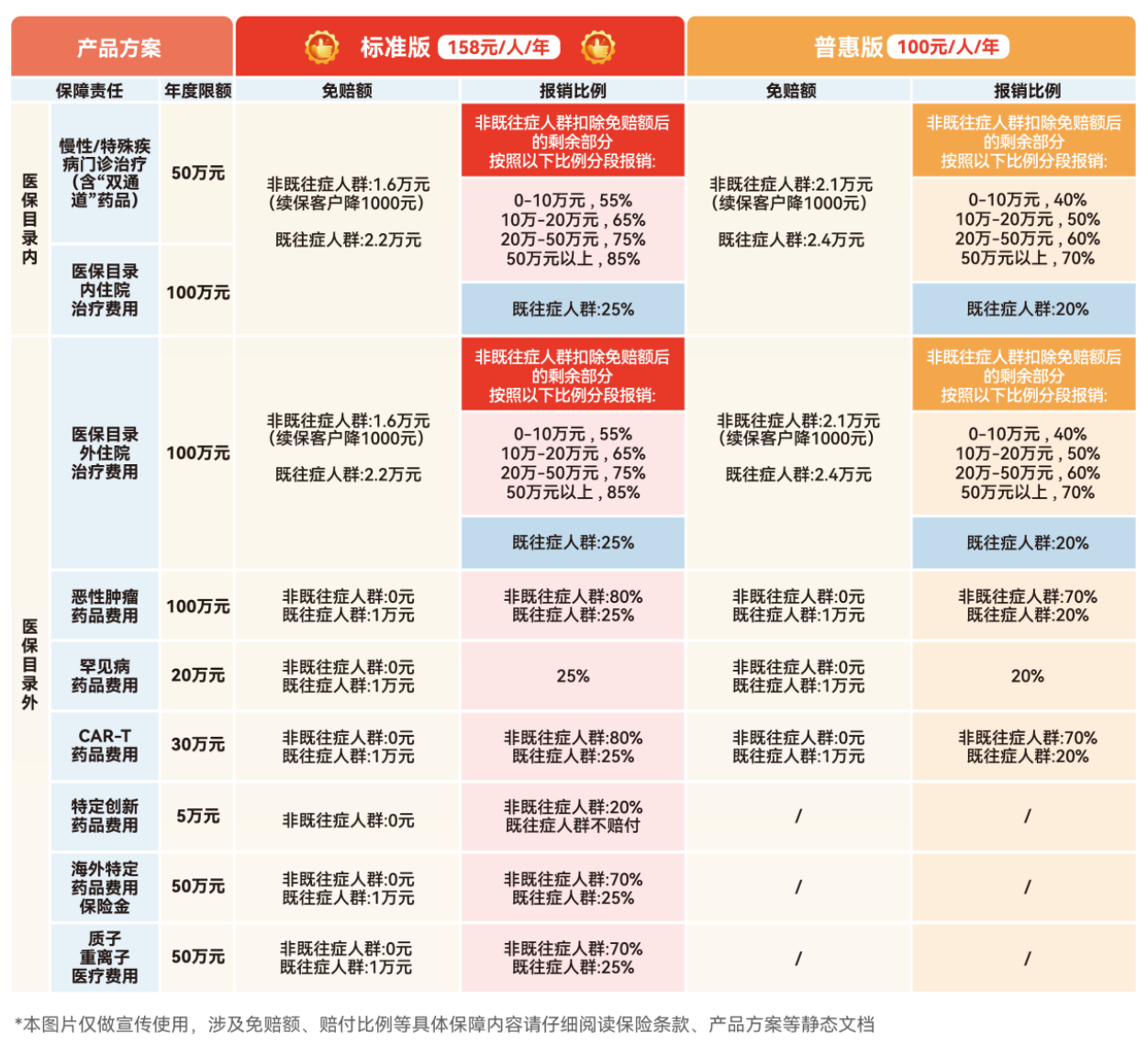 标准版有9大保障责任,进一步扩展创新药、海外特药和质子重离子医疗费用,同时降低免赔额,提升报销比例