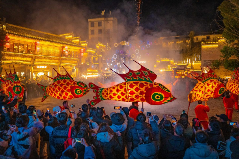 徽派建筑的白墙黛瓦、小桥流水的诗意景致,以及徽州鱼灯、火壶、水上民乐等街区演绎皆生动呈现,让游客及云端观众感受老城的独特韵味。活动还联合街区商家推出福利,游客可通过参与互动收集信物兑换礼品,在趣味互动中深化线下游玩的沉浸感与参与感。