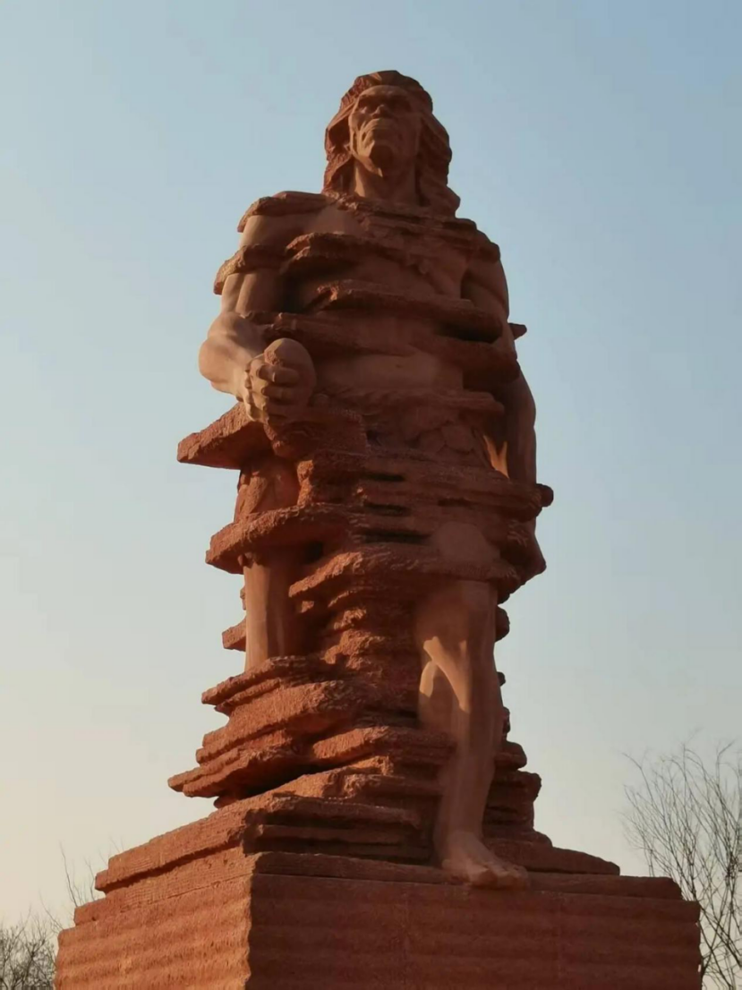 立体雕塑命名为“江右先民”,总高7.9米,其中基座3米、人物主体4.9米,刻意设计为低于周边9.9米的华表建筑,形成错落有致的景观层次。雕塑采用红色板岩石材质,色彩精准复刻安义旧石器发掘地的网纹红土肌理,从基座到人物主体自然过渡,仿佛先民从红土中走来。人物造型以“手持石斧、昂首前行”为核心意象,体态健壮、面容独特。这一形象并非凭空创作,而是经北京中国国家画院、清华美院等权威专家严格把关,以湖北省博物馆发布的“郧县人”头骨化石复原像为核心参考,通过电脑建模精准还原。该复原像是世界首次对距今100万年古人类头骨开展的科学相貌复原,为雕塑形象提供了坚实科学支撑。