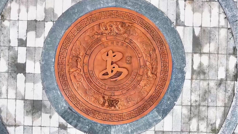与雕塑呼应的是地面圆形铜雕,直径2.7米,三层圈层,布局层层递进,承载文化与地理信息。外圈复刻安义县博物馆馆藏“双耳三足青铜盥盘”的“蟠虺纹”,这种源自春秋战国的神秘纹饰,首次从博物馆的青铜器上“走”出来,兼具辟邪祈福之意,让古老的祝愿真正“落地生根”;中圈以写意手法呈现“安义四景”——东有凤凰展翅、西有台狮流涎、南有魁星点斗、北有九龙奔岗,图案源自龙津历史文化街区古牌坊,生动再现地域风貌;内圈标注精确经纬度、东西南北方位,铭刻安义文化标识、“崇安重义,敢为人先”的城市精神,以及建县历史与原点建设时间,实现地理坐标与文化认同的高度统一。