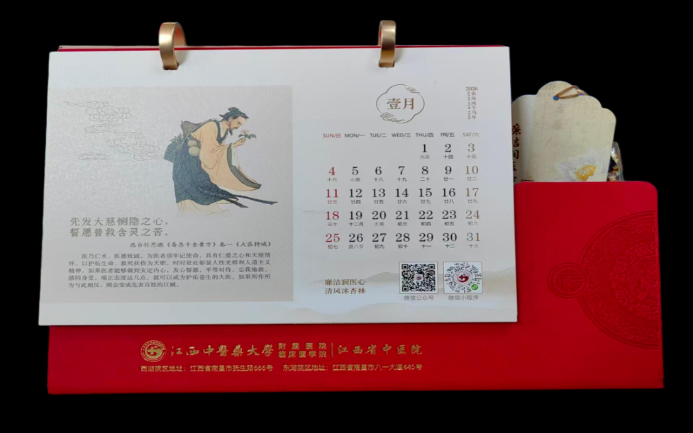 2026年元旦前夕,江西中医药大学附属医院结合中医药传统文化中的医德医风医道思想精髓,设计制作廉洁台历及廉洁书签,发放给全院200余名副护士长以上干部,这既是一份实用的廉洁提醒,也是医院“廉韵杏林”廉洁文化品牌建设成果的生动体现。近年来,医院立足自身中医药特色优势,积极打造“廉韵杏林”廉洁文化品牌,以廉洁文化建设持续涵养清风正气,为医院高质量发展筑牢纪律保障。