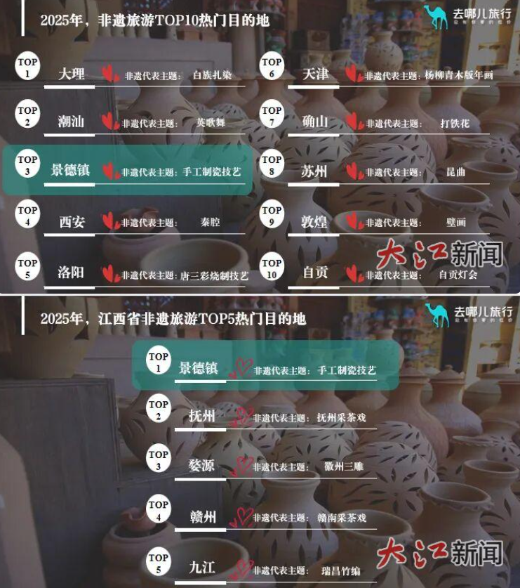 去哪儿旅行2025年景德镇非遗旅游市场数据显示,景德镇以手工制瓷技艺为核心的非遗旅游热度持续攀升。2025年,景德镇跻身全国非遗旅游TOP10热门目的地第3位,同时稳居江西省非遗旅游TOP5热门目的地首位;全年非遗关键词搜索量增长近八倍,相关关键词搜索量同比增幅达7.92倍。其中,景德镇瓷博会、古窑复烧、开窑体验位列非遗活动搜索热度前三。值得关注的是,2026年元旦期间,景德镇非遗相关话题热度增幅高达75%,非遗旅游市场持续升温。